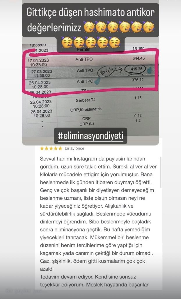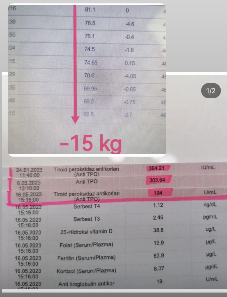 Aşağıdaki danışanımız, eliminasyon diyeti sonrası -15 kg verdi. Aynı zamanda Anti-TPO antikorları 364’ten 194’e düştü.